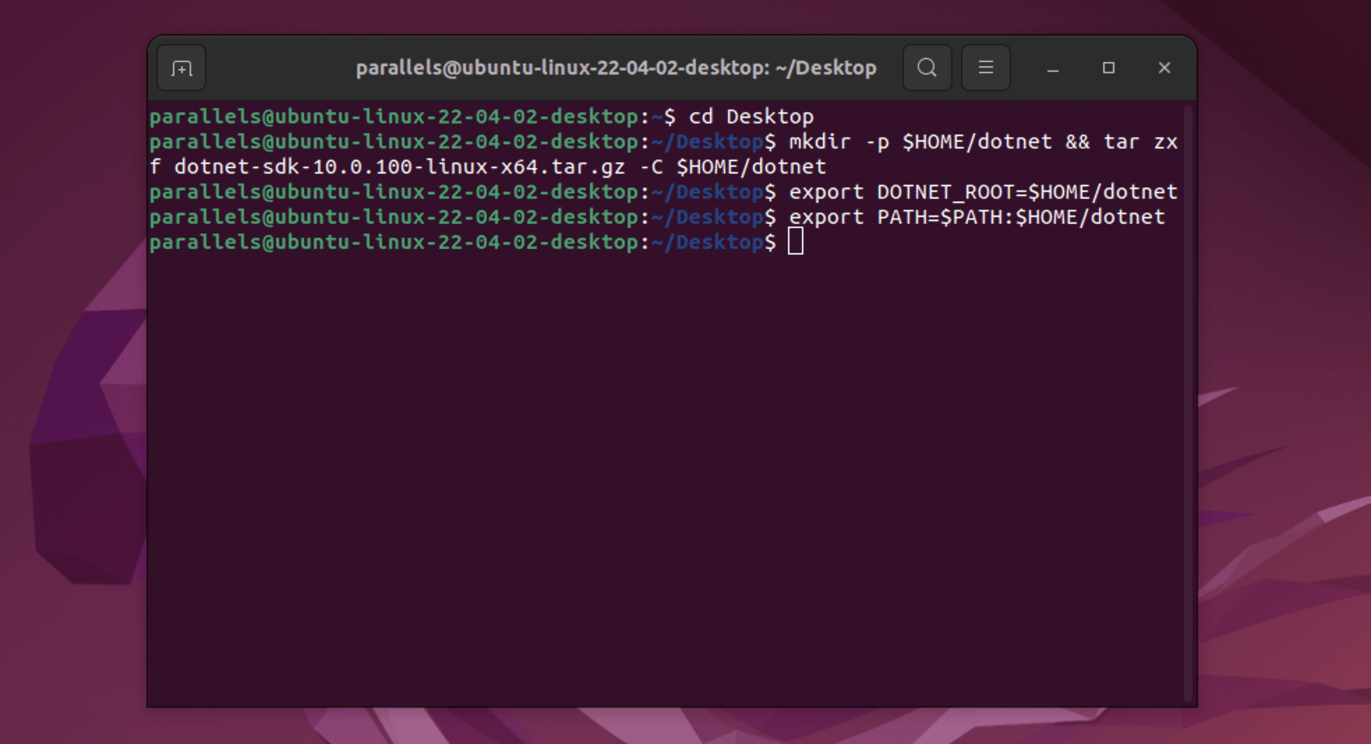 export PATH=$PATH:$HOME/dotnetThe previous commands will only make the .NET SDK commands available for the terminal session in which it was run.