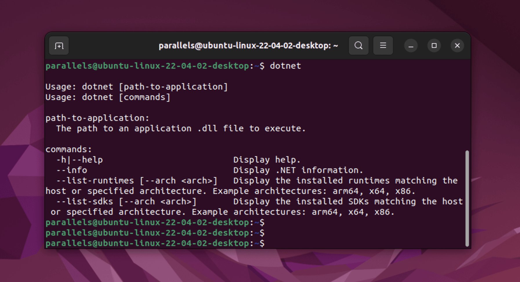 Run the dotnet command in your terminal. This will verify .NET is correctly installed and ready to use.